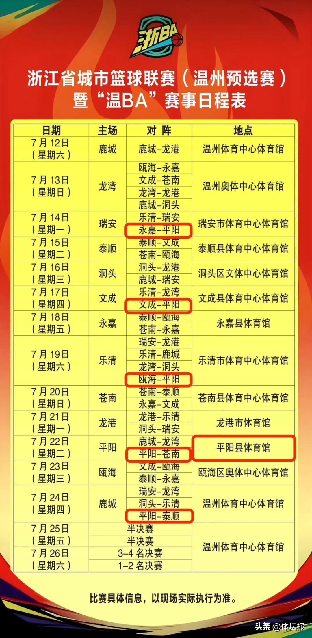 2025年浙江省城市籃球聯賽(浙BA)是浙江省規模最大、檔次最高的羣衆籃球賽事,賽程分預選賽和城市爭霸賽兩個階段。其中溫州賽區預選賽將於7月12號晚19:30正式拉開序幕,包括平陽隊在內12支各縣(市、區)代表隊將進行角逐,最終產生的冠軍球隊將代表溫州市直通浙BA省級城市爭霸賽的舞臺!