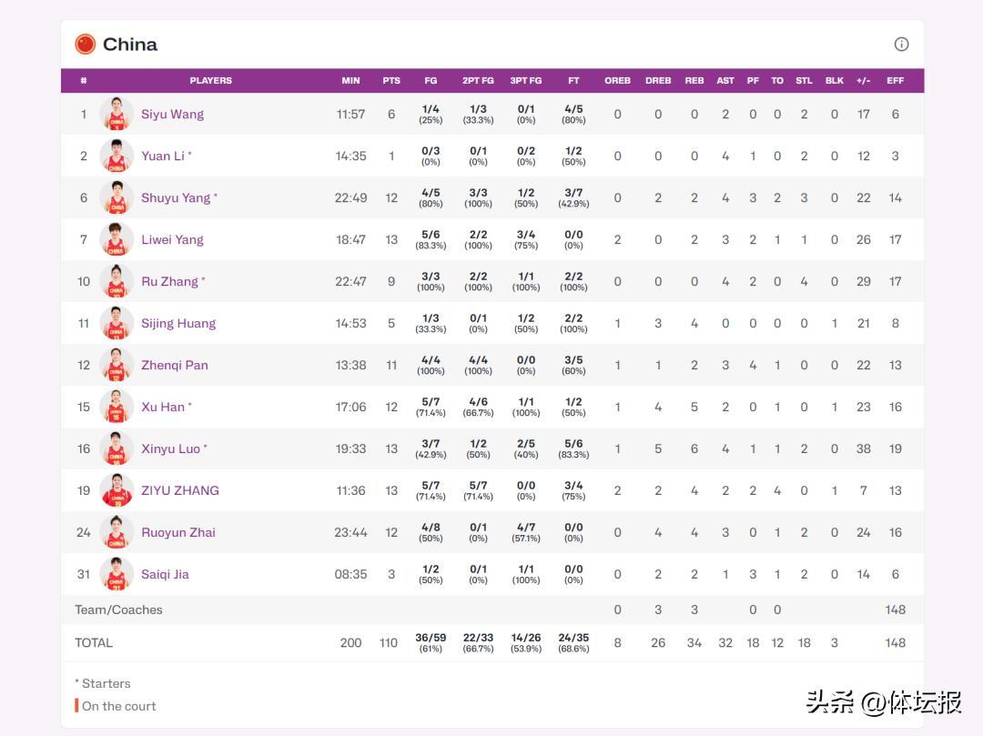 數據方面,共有七人得分上雙,羅欣棫13分6板4助2斷、張子宇13分4板2助、楊力維13分2板3助、韓旭12分5板2助、翟若雲12分4板3助2斷、楊舒予12分2板4助3斷、潘臻琦11分2板3助。