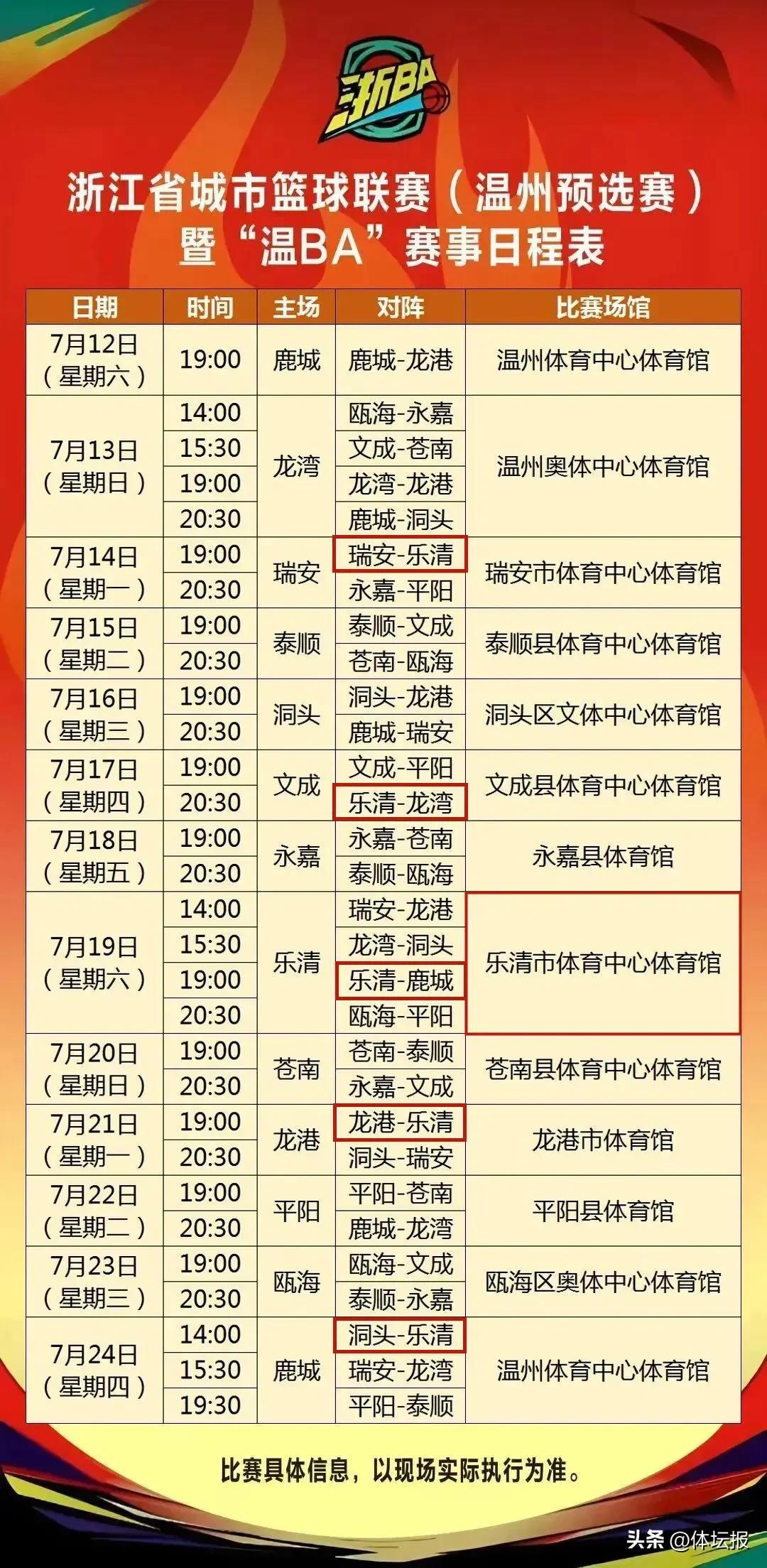 “浙BA”溫州預選賽從7月12日持續至7月26日,共上演34場精彩對決。根據之前的抽籤結果,A組爲鹿城、龍灣、洞頭、瑞安、樂清、龍港,B組爲泰順、永嘉、文成、甌海、蒼南、平陽,先進行小組主客場單循環賽,各組前兩名進行半決賽和決賽,勝出隊伍將代表溫州出戰8月8日開始的“浙BA”。