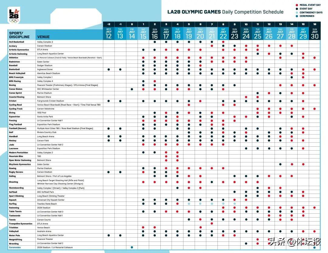 在官網首頁“2028 OLYMPIC GAMES COMPETITION SCHEDULE”板塊點擊“BY DAY”可以查看官方每日賽程(紅點爲獎牌日)如下: