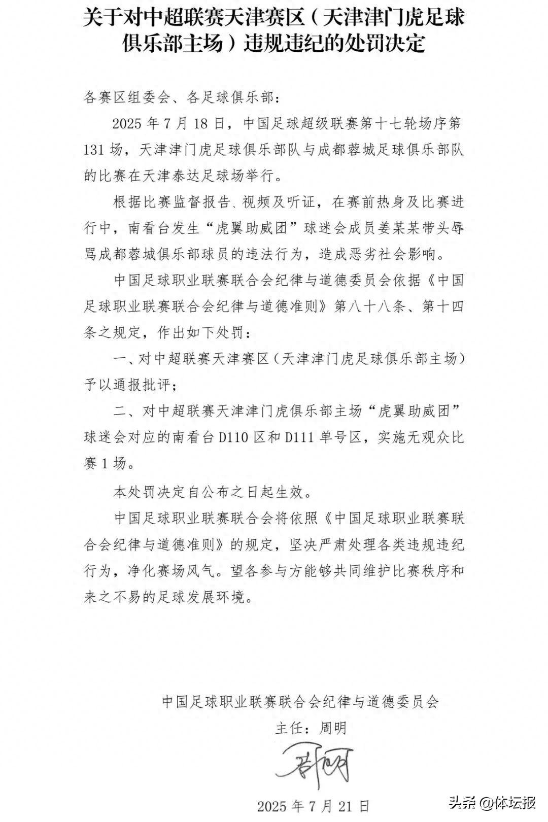 2025年7月18日,中國足球超級聯賽第十七輪場序第131場,天津津門虎足球俱樂部隊與成都蓉城足球俱樂部隊的比賽在天津泰達足球場舉行。根據比賽監督報告、視頻及聽證,在賽前熱身及比賽進行中,南看臺發生“虎翼助威團”球迷會成員姜某某帶頭辱罵成都蓉城俱樂部球員的違法行爲,造成惡劣社會影響。