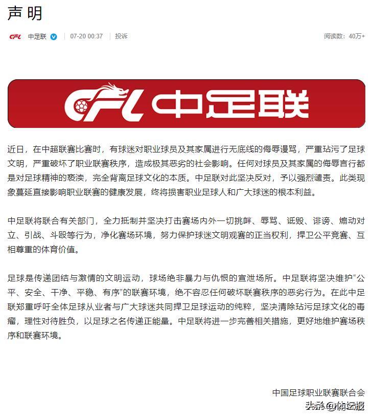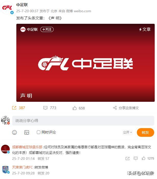 7月20日,中足聯發佈聲明,表示對此堅決反對,予以強烈譴責。截至目前,中超16支球隊已經全部轉發了中足聯的聲明,包括當事雙方天津津門虎和成都蓉城。