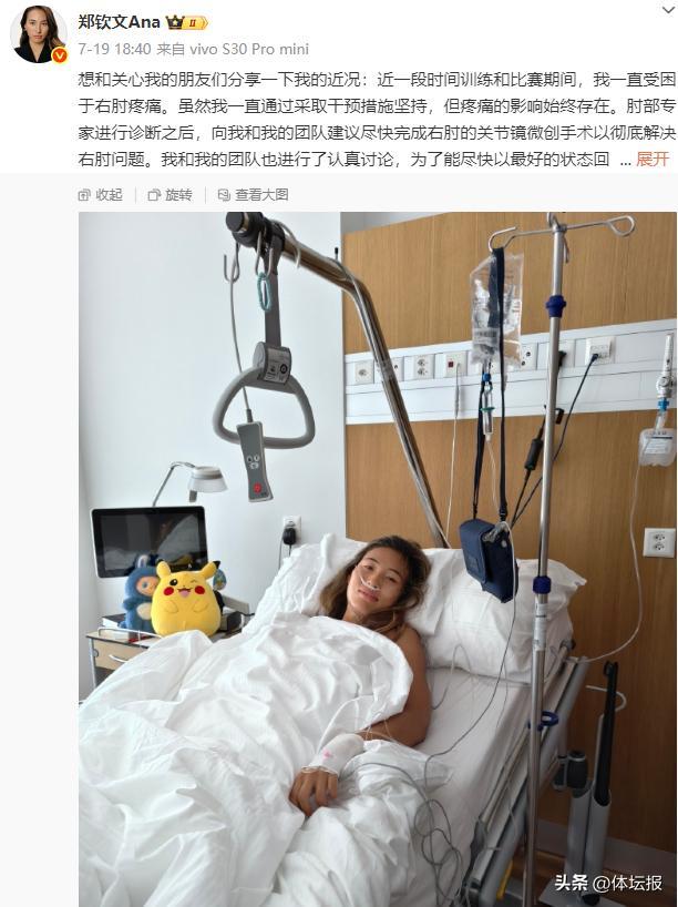 7月19日,鄭欽文在社交媒體上發文宣佈自己已完成右肘手術,目前正在積極康復中。
