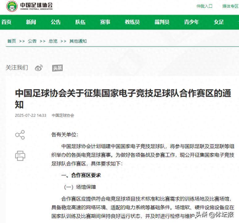 7月22日,中國足協官網發佈中國足球協會關於徵集國家電子競技足球隊合作賽區的通知: