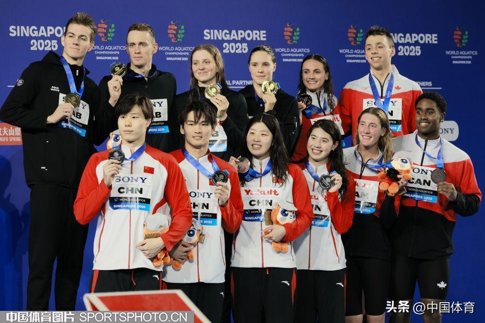 中國體育訊 當地時間7月30日,2025年世界游泳錦標賽在新加坡體育城世錦賽游泳館繼續進行,在男女4x100米混合泳接力決賽中,由徐嘉餘、覃海洋、張雨霏、吳卿風組成的中國隊以3分39秒99的成績奪得銀牌。(中國體育圖片特派記者 鹿麟 攝)徐嘉餘在比賽中覃海洋在比賽中張雨霏在比賽中吳卿風在比賽中中國隊在頒獎儀式上