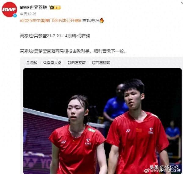7月30日,超級300級別的2025年中國澳門羽毛球公開賽混雙首輪,浙江小將吳夢瑩與搭檔高家炫21:7、21:14兩局輕取馬來西亞組合劉珣/何若旖,順利晉級下一輪。