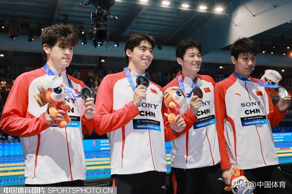 中國體育訊 當地時間8月1日,2025年新加坡世界游泳錦標賽游泳比賽繼續進行。男子4X200米自由泳接力決賽中,由季新傑、潘展樂、汪順、張展碩組成的中國隊,以7分00秒91的成績奪得銀牌並創造新的亞洲紀錄。季新傑在比賽中潘展樂在比賽中汪順在比賽中張展碩在比賽中(左起)季新傑、汪順、潘展樂爲隊友加油(左起)季新傑、汪順、潘展樂慶祝奪得銀牌(左起)潘展樂、季新傑、汪順、張展碩在頒獎儀式上(中國體育圖片特派記者 鹿麟 攝)