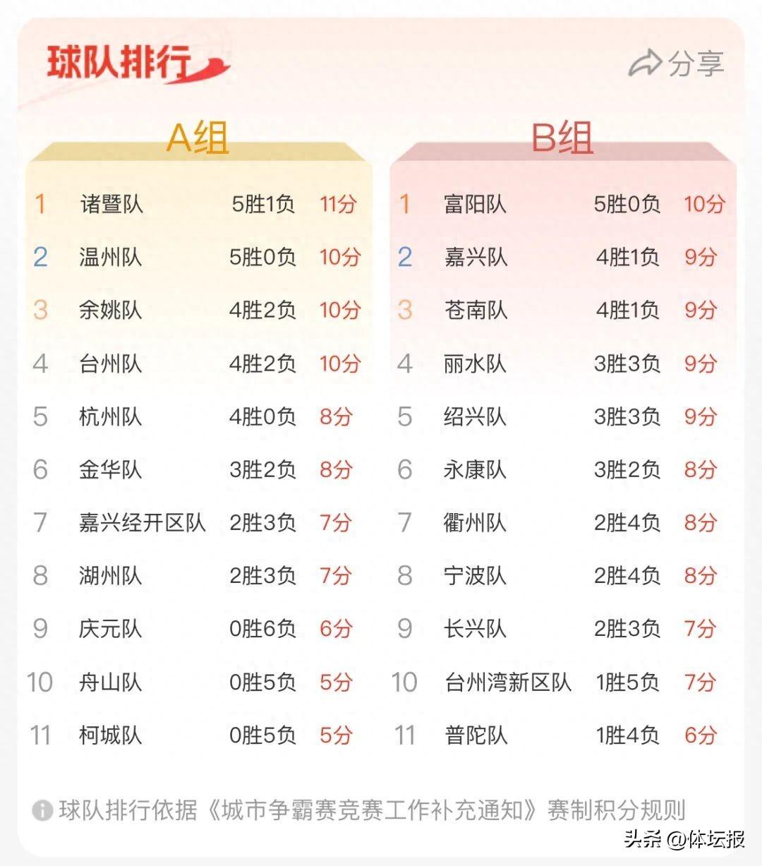 上週(9月15日—9月21日),“浙BA”城市爭霸賽進行了9場對決。截至9月22日12點,球隊排行如下: