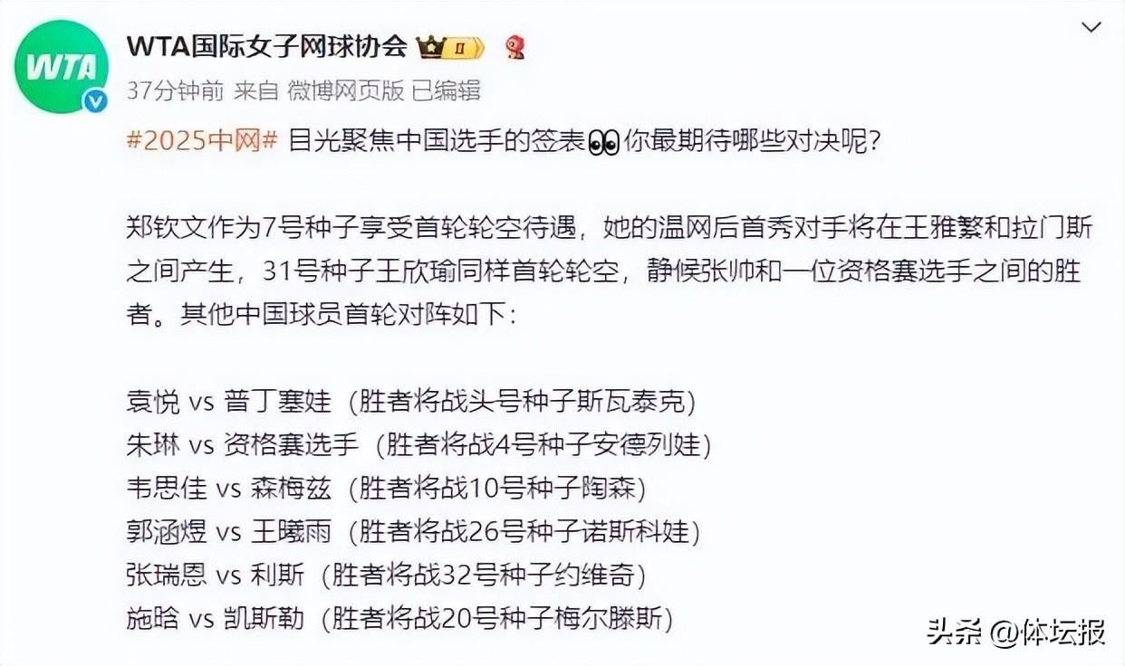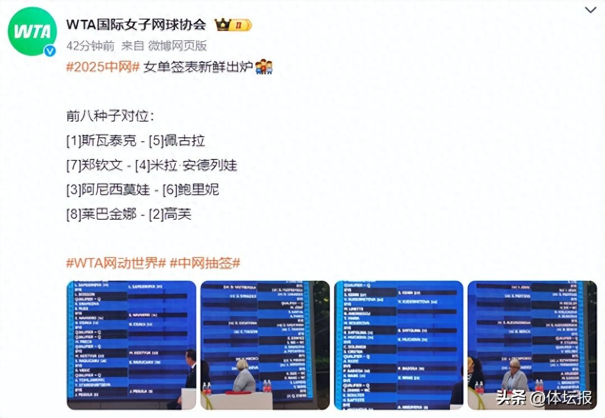 北京時間9月22日,2025中國網球公開賽舉行女單抽籤儀式,衛冕冠軍高芙擔任抽籤嘉賓。備受關注的鄭欽文作爲賽會7號種子,對位“小米辣”米拉·安德列娃。