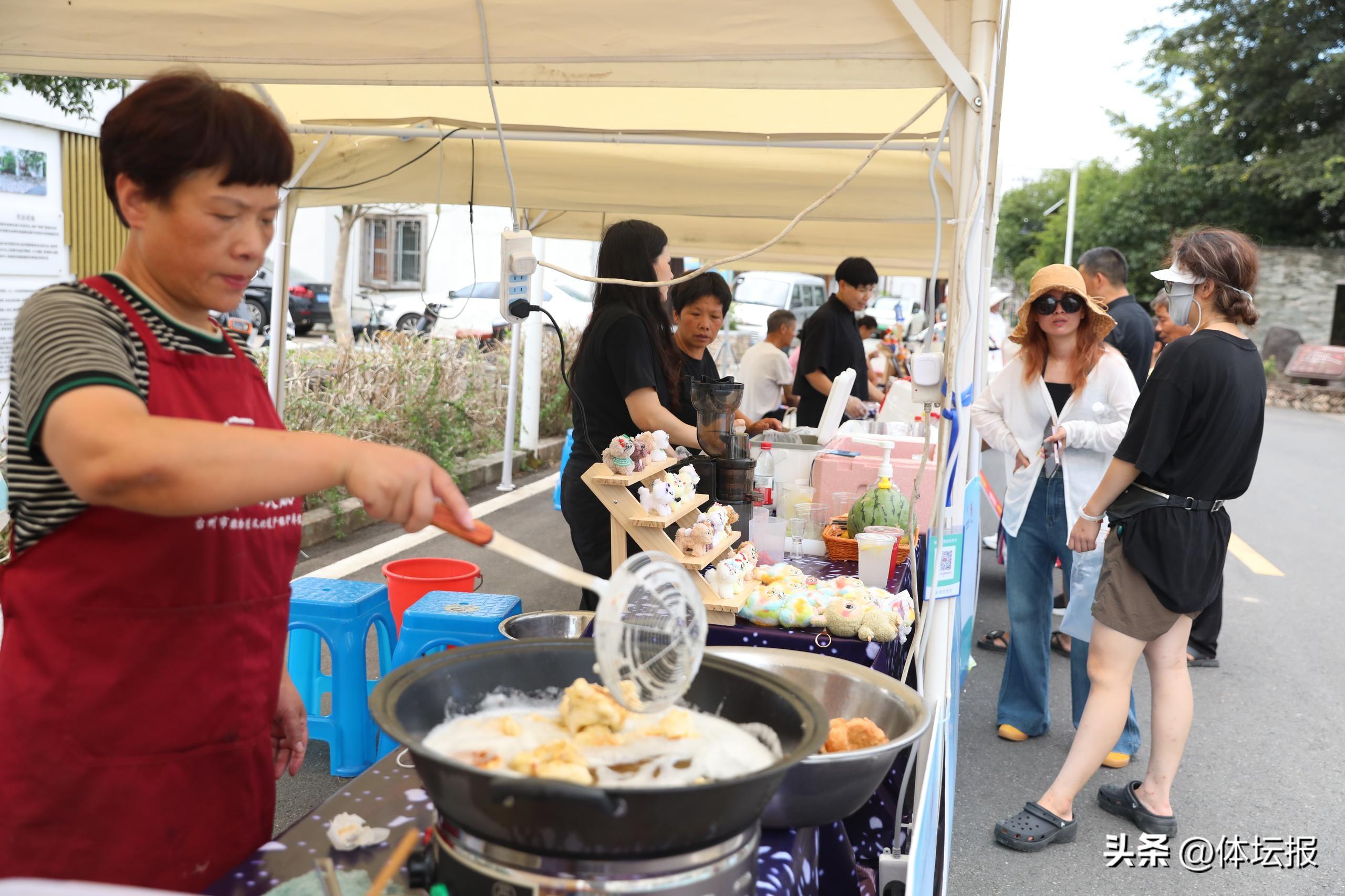 比賽當天,楊豐山頂上,迎接選手們的,是一道道大鍋菜,大塊的仙居土豬肉,一碗碗熱氣騰騰的澆頭面,熱鬧的美食集市中,選手們流連在各個攤位前,仙居燒餅、青草糊、楊梅冰飲等銷售一空。