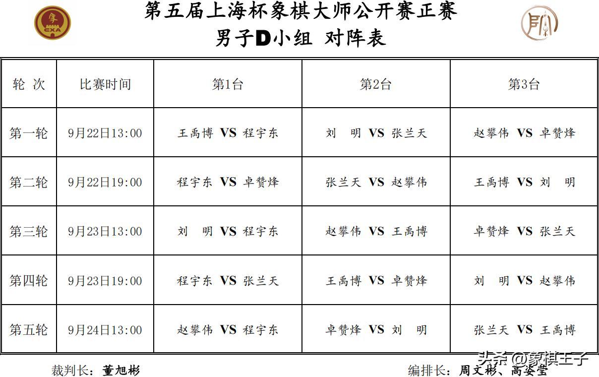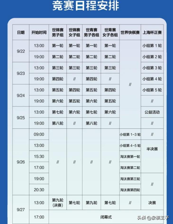 9月22日下午一點起,至27日,每天下午一點、晚上七點,世錦賽、上海杯雙賽同時上映,王者之戰,逐鹿天下,誰能一舉殺出,分奪兩項頂級賽會總冠軍,勇獲金牌榮耀,象棋王子抖音號全程直播。