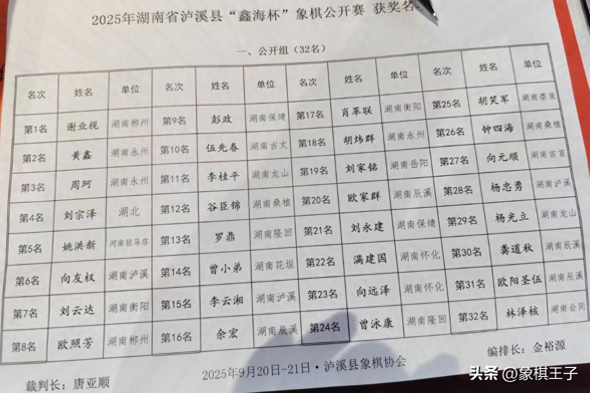 是日的弈林,湘西東南,沅水明珠,2025年湖南省瀘溪縣“鑫海杯”象棋公開賽在此間盛大落幕,火爆收兵。