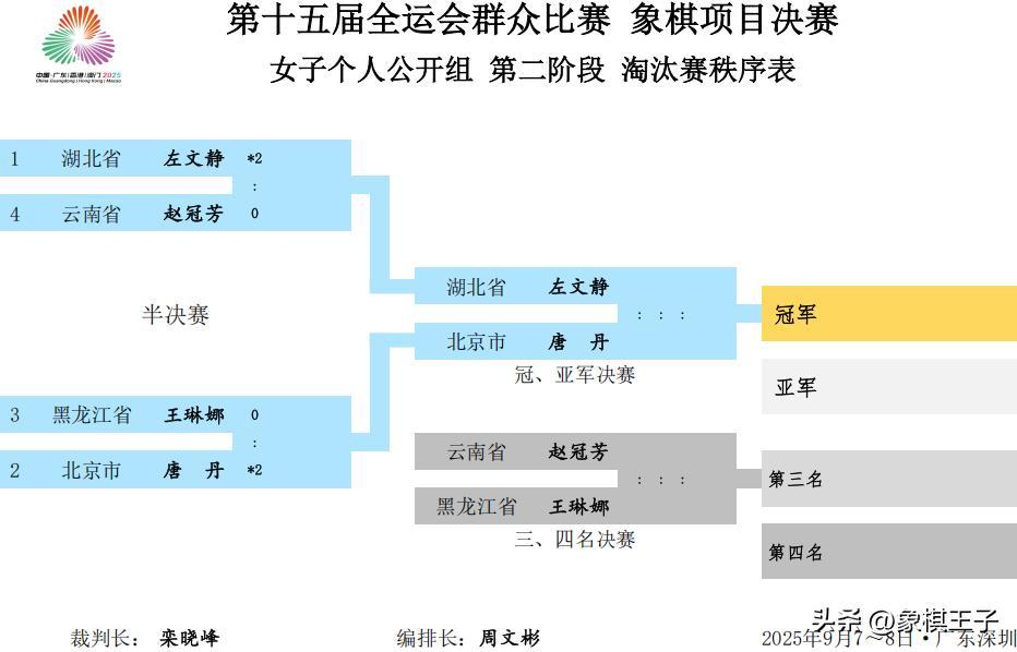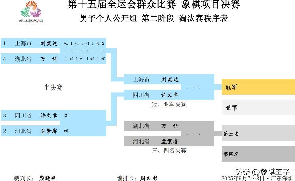 全運會象棋的大斗,四強半決賽猛烈廝殺,男子公開組,許文章劉奕達會師決賽,女子唐丹左文靜爭冠。
