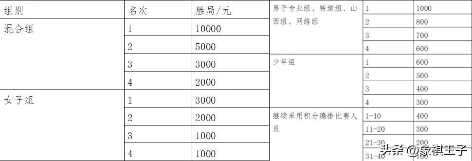 賽會對全國男女冠軍,每人補貼一萬元,給予優待,對國外棋手,補貼三千,承擔所有棋手食宿,安排接站。