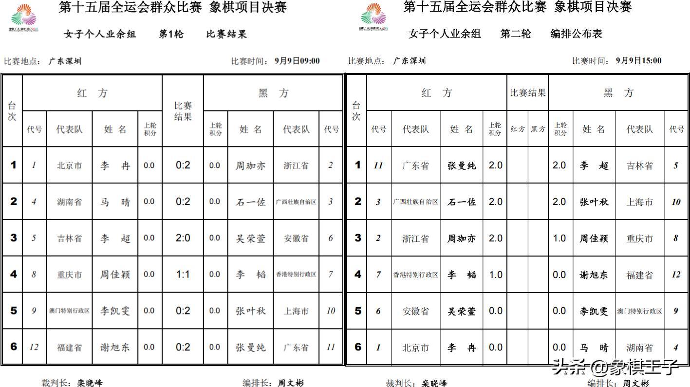 重慶隊周佳穎、香港隊李韜1分,北京隊李冉、湖南隊馬晴、安徽隊吳榮萱、澳門隊李凱雯、福建隊謝旭東0分。