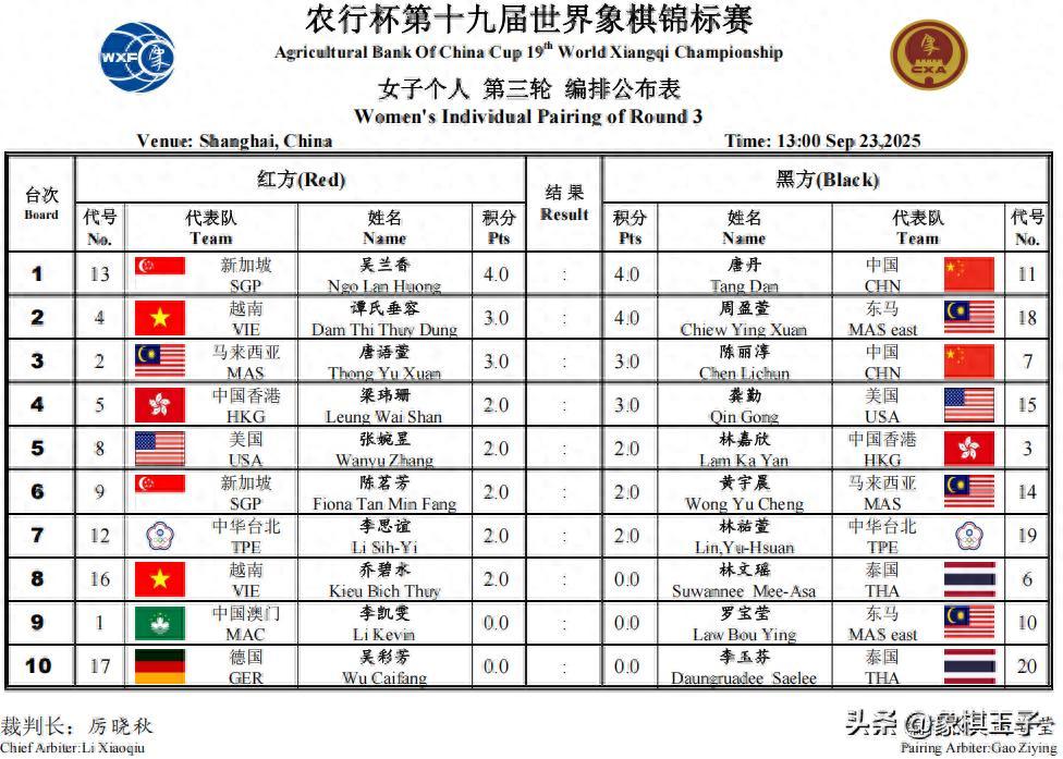 首日兩戰下來,女子組,中國隊唐丹、新加坡隊吳蘭香、東馬隊周盈萱,三人連勝積4分,中國隊陳麗淳、越南隊譚氏垂容、美國隊龔勤、馬來西亞隊唐語萱,四人積3分。