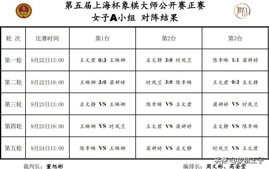 首日兩輪過後,女子A組王琳娜、左文靜6分,時鳳蘭3分,陳幸琳、梁妍婷1分,王文君0分。