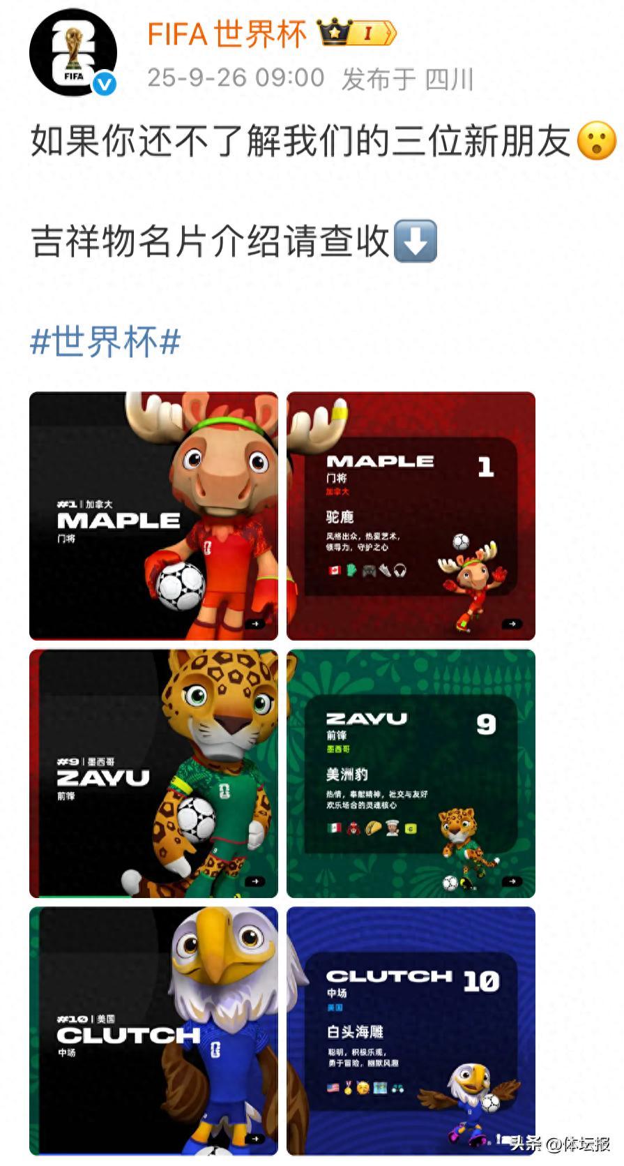 國際足聯介紹,“梅普爾”是自由奔放的駝鹿,熱愛街頭文化與音樂,是勇敢且富有創造力的守門員;“薩尤”是來自南部叢林的美洲豹,名字寓意團結與歡樂,場上是敏捷機智的前鋒;“克拉奇”是擁有無畏精神的白頭海雕,是充滿冒險精神和樂觀態度的中場核心。