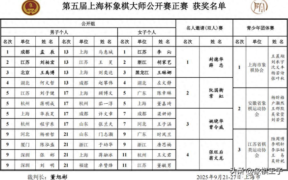 到此,本屆世錦賽和上海杯都告以結束,歷經六天的戰程,圓滿收官,上海杯世界棋王孟辰特大勇奪總冠軍,豪取二十萬大獎,李沁女子桂冠。