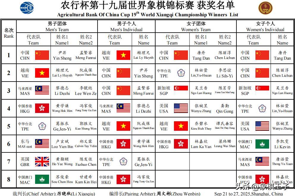其中女子象棋歷史第一人,九冠王、超級丹唐丹勇獲女子個人世界四冠王,與陳麗淳特大一起女團登頂,中國隊捍衛女子榮耀。
