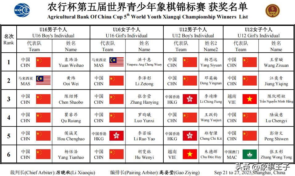 根據規則,世界青少年錦標賽(U16個人)前三名晉升大師,中國隊男子袁瑋浩、陳紹博,女子李澤彤、張含瑩,成爲四位新的男女國家大師。