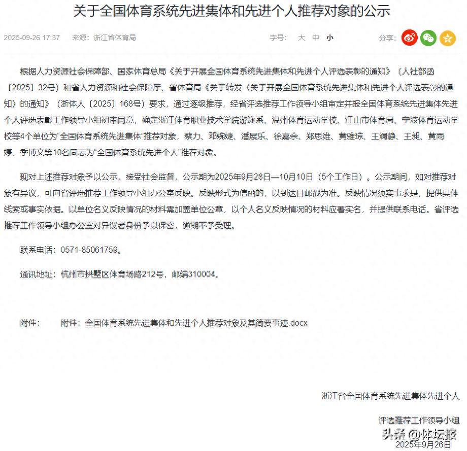 9月26日,浙江省體育局官網發佈了《關於全國體育系統先進集體和先進個人推薦對象的公示》。