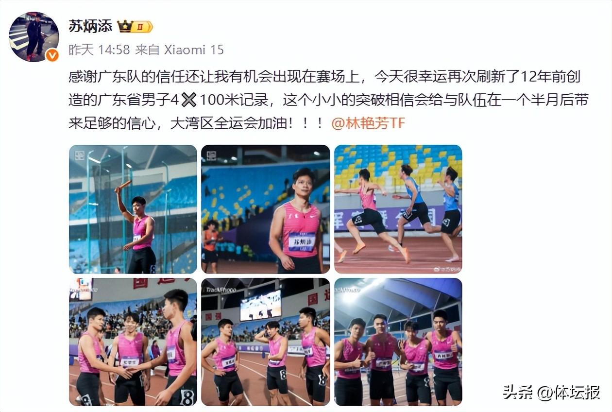 9月27日,蘇炳添發文:“感謝廣東隊的信任還讓我有機會出現在賽場上,今天很幸運再次刷新了12年前創造的廣東省男子4×100米紀錄,這個小小的突破相信會給予隊伍在一個半月後帶來足夠的信心,大灣區全運會加油!”
