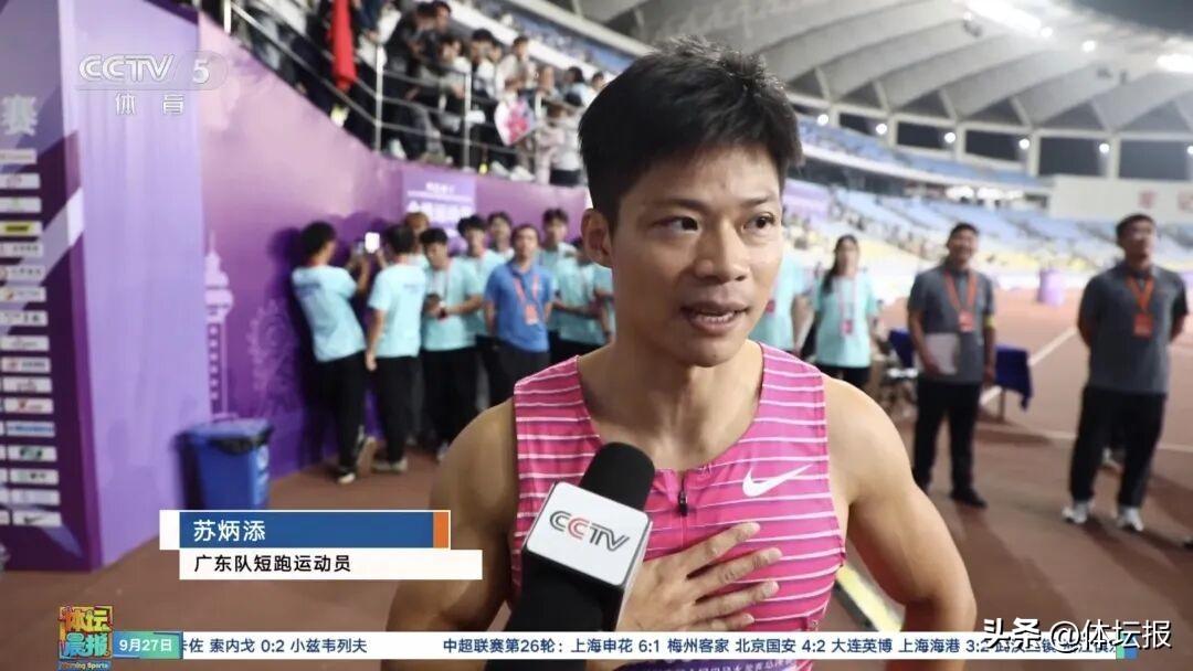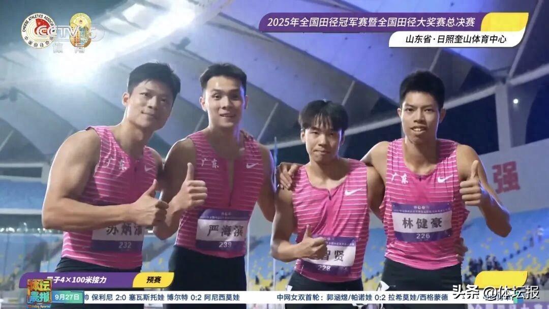 9月26日晚,在2025年全國田徑冠軍賽男子4×100米接力預賽中,由蘇炳添擔任第一棒的廣東隊以38秒60的成績奪得第一名,將12年前廣東隊在遼寧全運會上以38秒73奪冠時創下的省紀錄又提升了0.13秒。