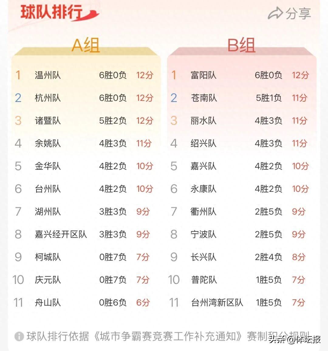 目前“浙BA”城市爭霸賽第七輪比賽已經結束,第八輪比賽(A組慶元輪空、B組麗水輪空)將從10月1日開打。至今六連勝(戰無敗績)的隊伍爲:杭州隊、溫州隊、富陽隊。