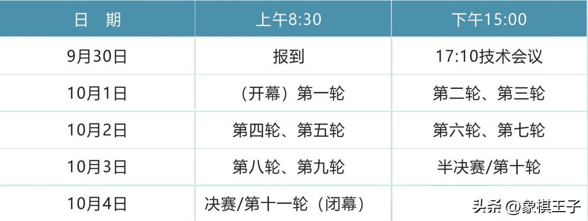賽事日程10月1日,國慶節當天上午八點半揭幕戰,第一輪,及開幕式,下午三點第2、3輪;2日上午八點半、下午三點,第4-7輪;3日上午八點半,第8、9輪,預賽最後兩輪決勝戰,下午三點,四強半決賽;4日上午八點半,王總生日當天,冠軍總決賽。