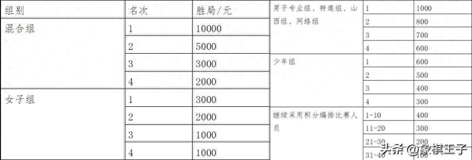 比賽對男女全國冠軍,每人補貼一萬元,特別優待,對國外棋手,補貼三千,承擔所有棋手食宿,安排接站。