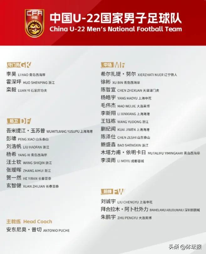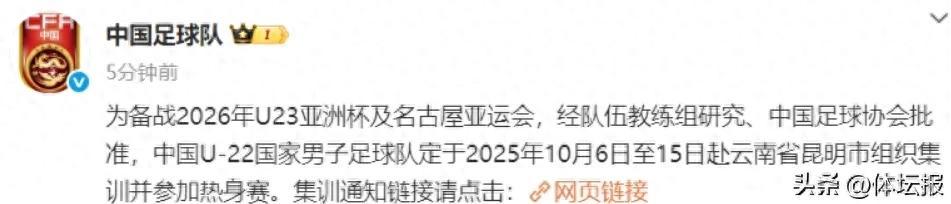爲備戰2026年U23亞洲盃及名古屋亞運會,中國足協公佈新一期U22國足集訓名單。