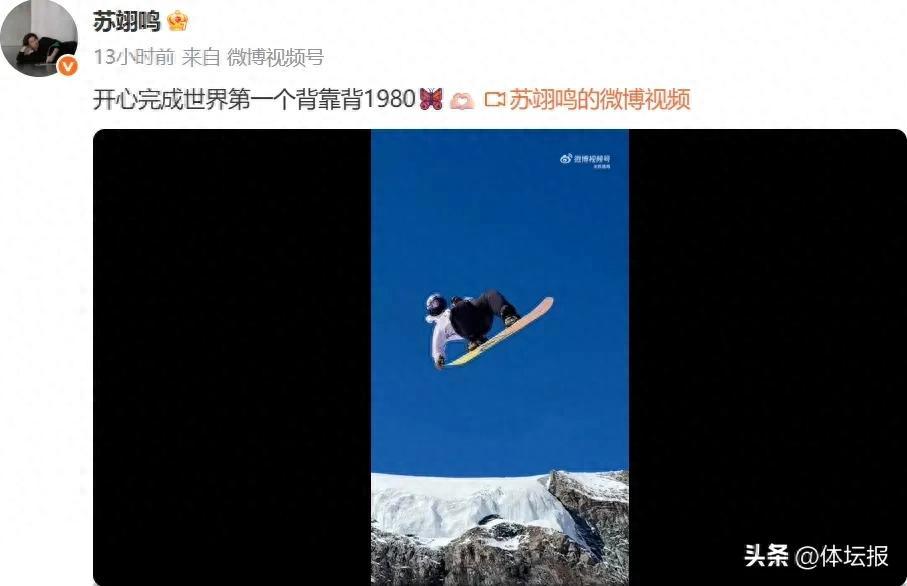 10月9日晚,中國單板滑雪運動員蘇翊鳴在社交媒體曬出滑雪視頻,並配文:開心完成世界第一個背靠背1980。