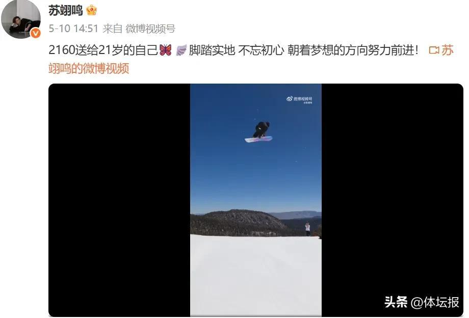 蘇翊鳴也在不斷努力提升動作難度。今年5月,他首次成功完成2160的高難度動作,正式加入“2160俱樂部”。當天,他曾曬出視頻:2160送給21歲的自己,腳踏實地,不忘初心,朝着夢想的方向努力前進!