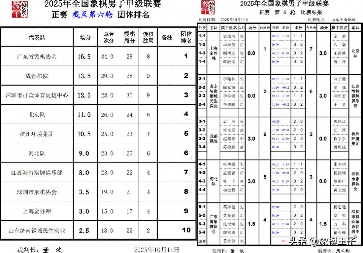 六輪後十戰隊積分,廣東16.5分,成都13.5分,深圳12.5分,北京11分,杭州10.5分,河北9分,江蘇8分,深協3.5分,上海3分,山東2.5分。