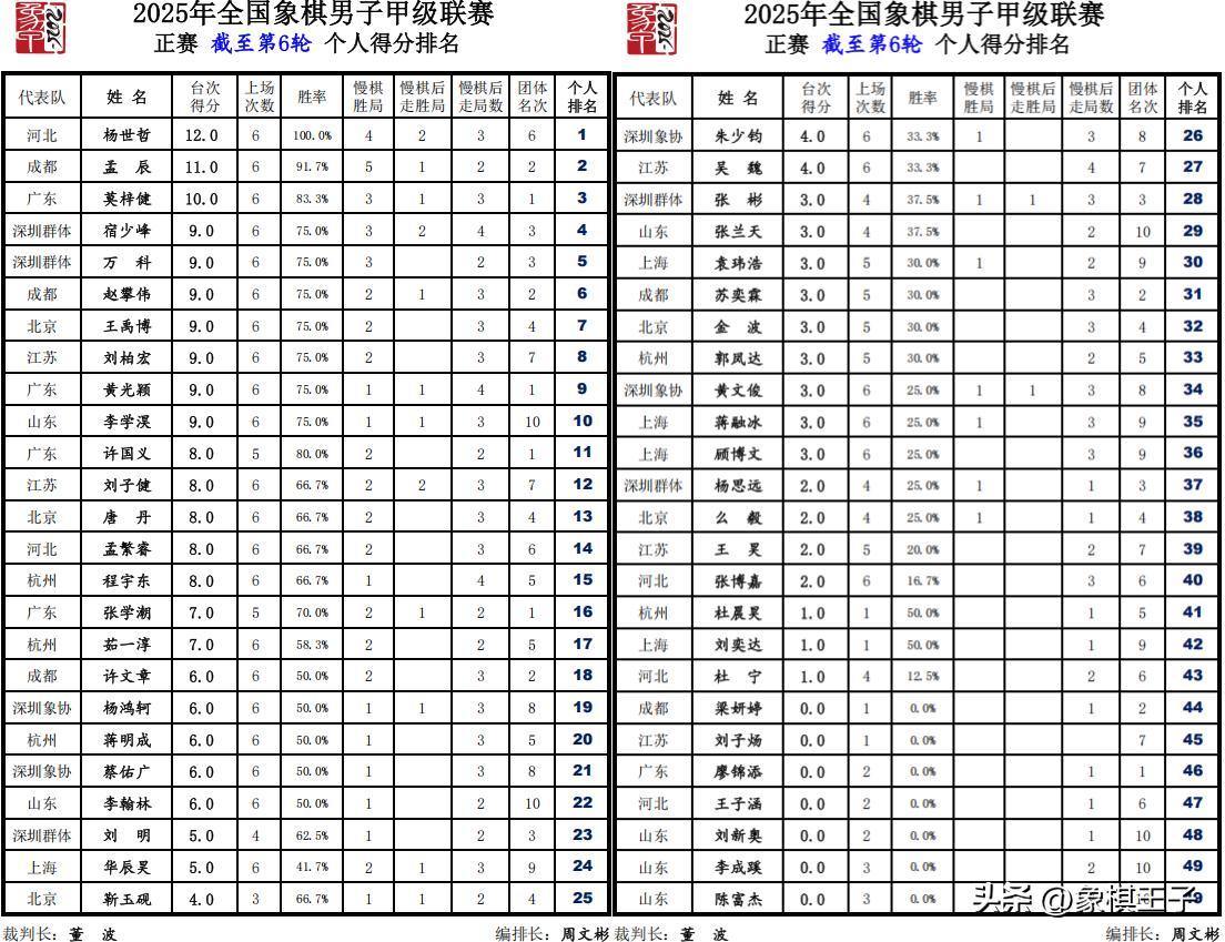 相比於稍在前1分的楊世哲和前八名其他戰將,孟辰是前列唯一沒輸過棋的,比賽個人得分因只統計常規局,不計主將加賽。