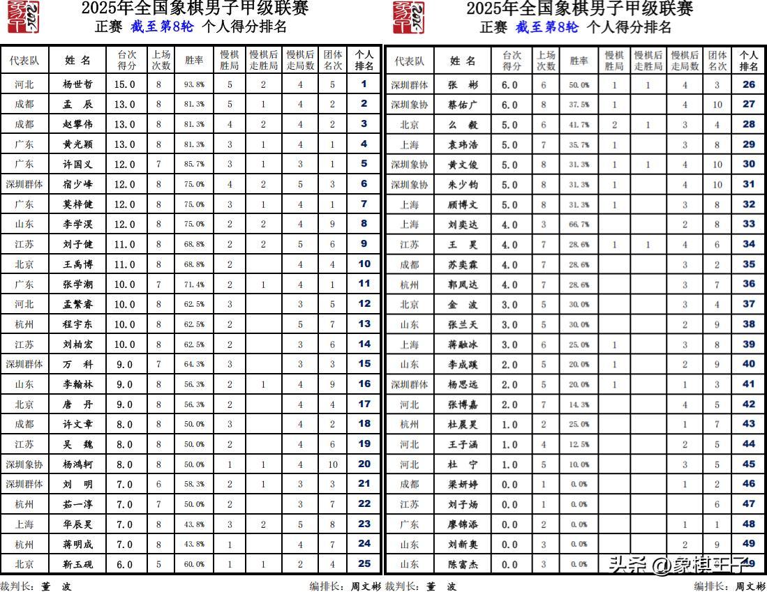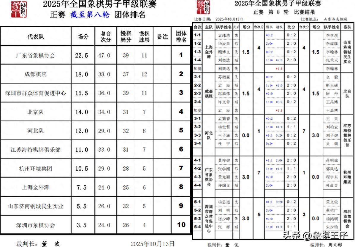 比賽八戰之下,廣東22.5分,成都18分,深圳15.5分,北京14分,河北12分,江蘇11分,杭州10.5分,上海7.5分,山東5.5分,深協3.5分。