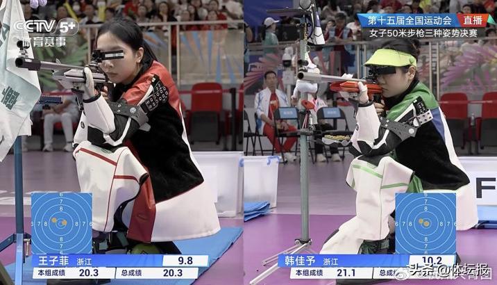 在上午結束的女子50米步槍三姿資格賽中,兩位浙江姑娘韓佳予和王子菲分別以總成績第一和第三晉級決賽。決賽中,18歲的杭州姑娘王子菲從第7一路狂追,最後以462.9環的成績奪得金牌。
