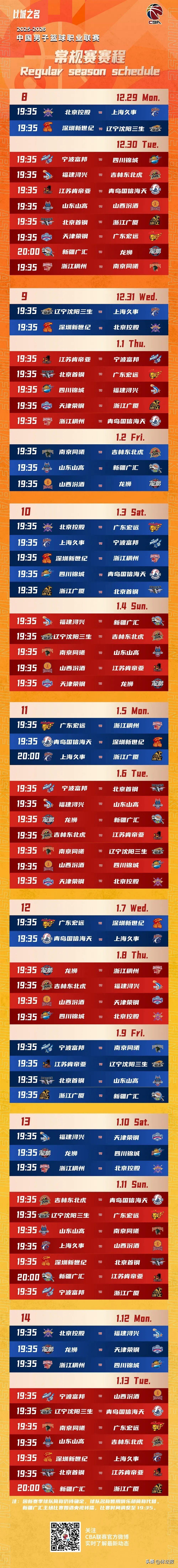 明年4月24日,浙江三支球隊將在同日迎來常規賽最後一戰。浙江廣廈將主場對陣天津榮鋼,浙江稠州將來到客場面對四川錦城,寧波富邦則將主場迎戰北京控股。