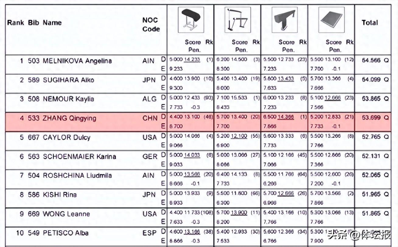 其中,來自浙江的張清穎出戰全部四項。第一項平衡木,張清穎的成套難度爲6.5,達到全場最高,最終拿下14.366分,並以資格賽第一名的成績晉級平衡木決賽,也爲衝擊全能高排名積累了一個高分。其他幾項分別是自由體操12.833分、跳馬13.100分,高低槓13.400分,最終以總分53.699分排名資格賽第4躋身全能決賽“爭冠組”。
