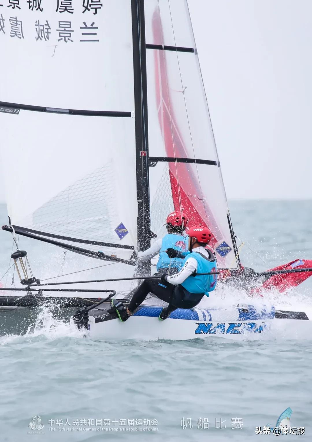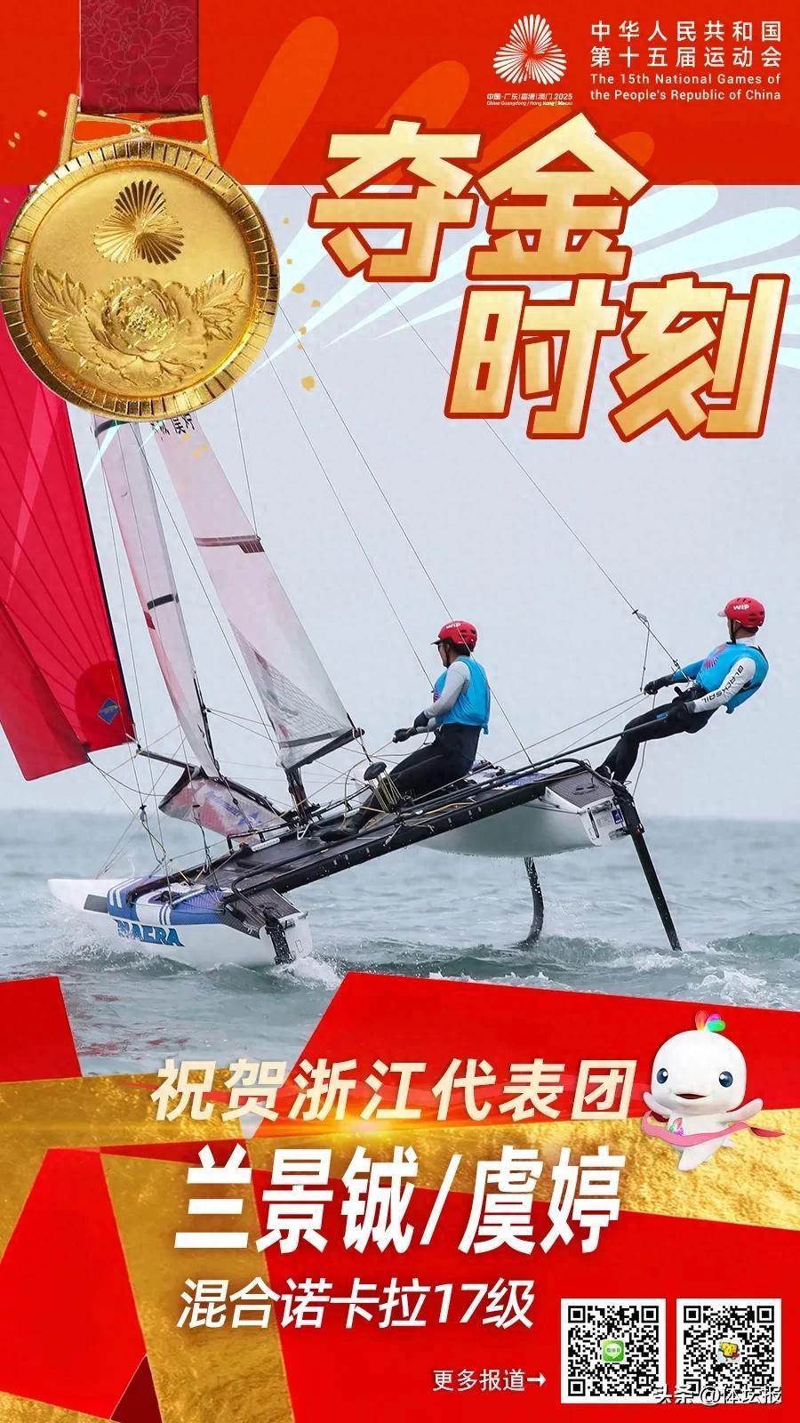 10月29日,浙江帆船組合虞婷和蘭景鋮在第十五屆全國運動會混合諾卡拉17級比賽中,憑藉默契配合與頑強毅力摘得金牌。