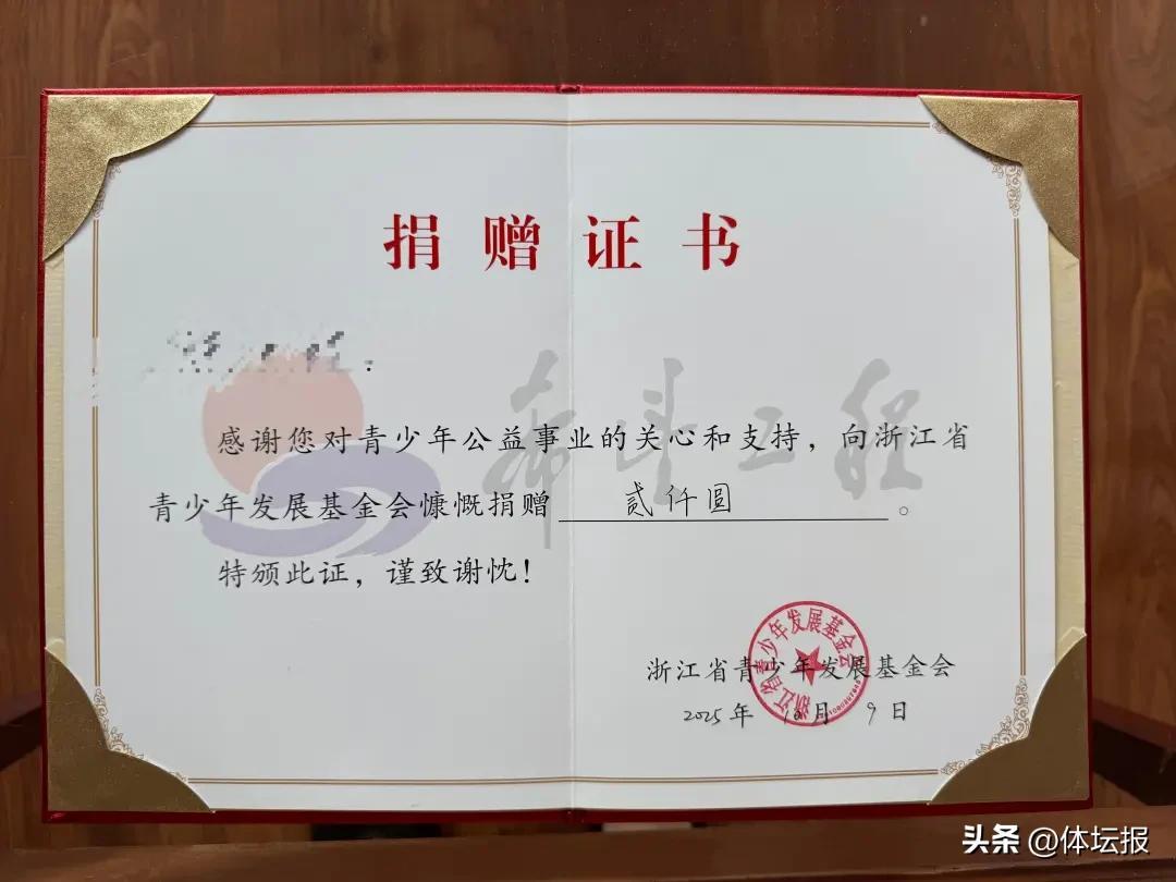 唯一讓王先生感到些許遺憾的是,他當期共買了3張彩票,只有中得大獎的這張忘記了追加投注,錯失了部分追加獎金。“不過我覺得能中獎已經很幸運了。”王先生展現出豁達的心態,他從獎金中捐出4000元用於公益事業,其中2000元捐贈至浙江省體育基金會,另外2000元贈予浙江青少年發展基金會。