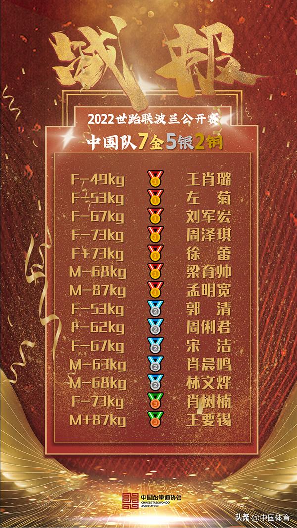 中國體育訊 中國跆拳道協會消息,北京時間9月11日晚,從波蘭首都華沙傳來捷報,中國跆拳道隊以7金5銀2銅的佳績,圓滿結束了2022年世界跆拳道波蘭公開賽征程。