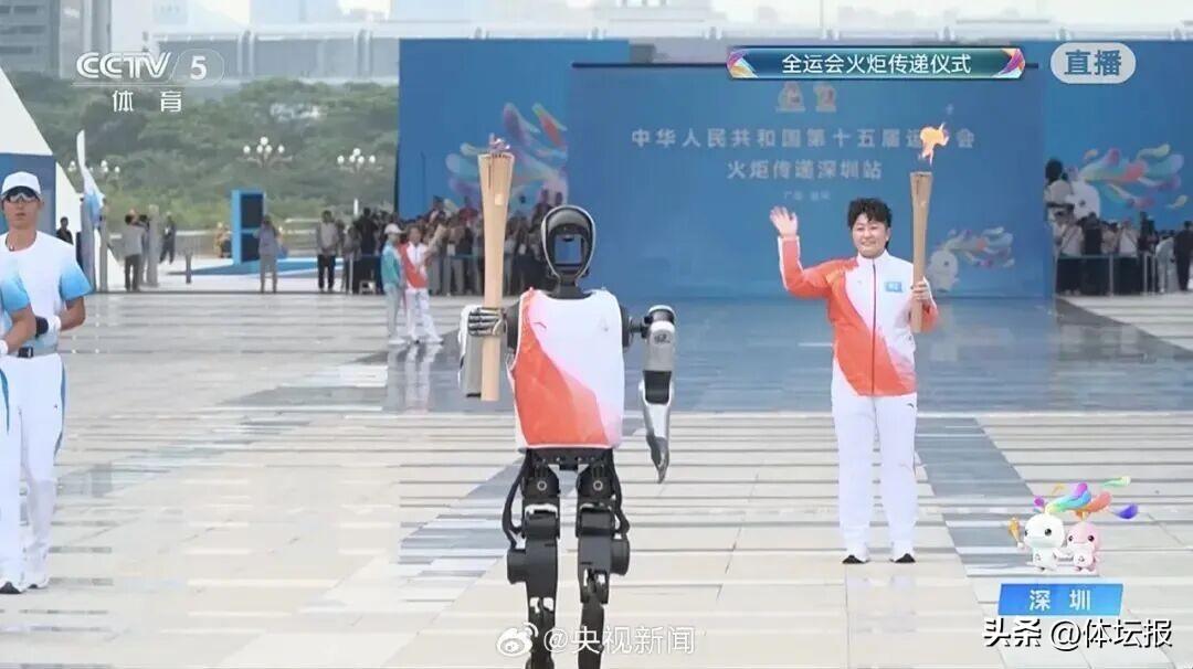 北京奧運會羽毛球冠軍於洋擔任第2棒火炬手,她和深圳機器人“夸父”同框傳遞火炬,展示十五運科技風采與含量。