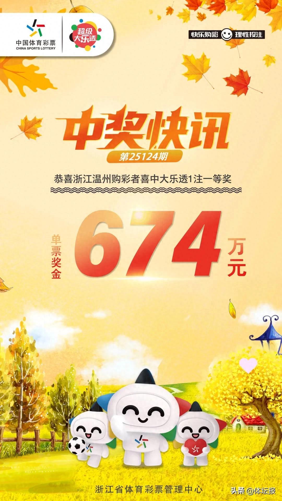 11月1日,體彩大樂透第25124期開獎,當期全國中出18注一等獎,單注獎金658萬元。本期溫州中出1注一等獎,單票獎金爲674萬元。