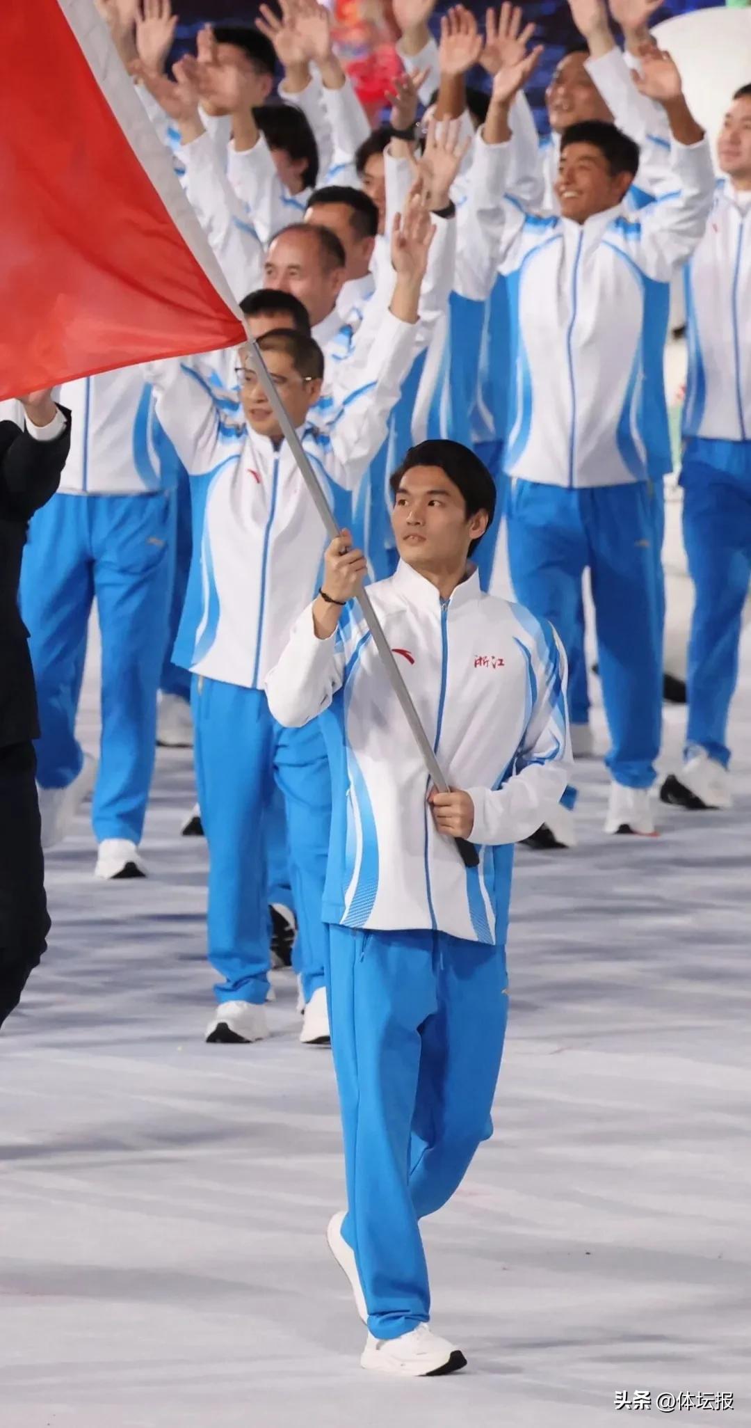 在萬衆矚目下,游泳奧運冠軍徐嘉餘高擎浙江體育代表團的旗幟,引領浙江健兒在全場熱烈的掌聲中昂揚入場。