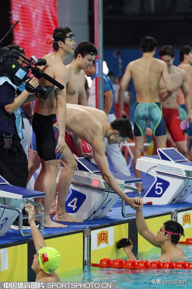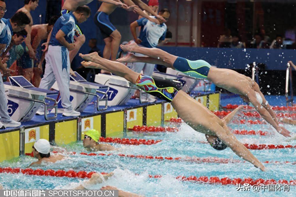 中國體育訊 11月10日,第十五屆全運會游泳比賽繼續在深圳大運中心遊泳館進行。在男子4x100米自由泳接力決賽中,浙江隊獲得冠軍。(中國體育圖片 安靈均 攝)浙江隊潘展樂(中)在比賽中浙江隊何峻毅(中)在比賽中浙江隊何峻毅(中)在比賽中浙江隊潘展樂(左)在比賽中浙江隊潘展樂(右下)與隊友慶祝勝利