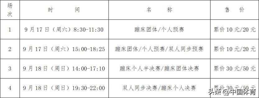 作爲國內蹦牀項目最高水平比賽之一,本次冠軍賽共計15支隊伍,約120名運動員參加。比賽門票已於9月14日中午12:00開售,門票價格非常親民,其中預賽票價爲10元或20元,決賽票價爲30元或50元。