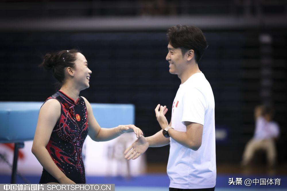 資料圖:董棟教練向在全錦賽中表現不俗的朱雪瑩表示祝賀(中國體育圖片 張昕 攝)
