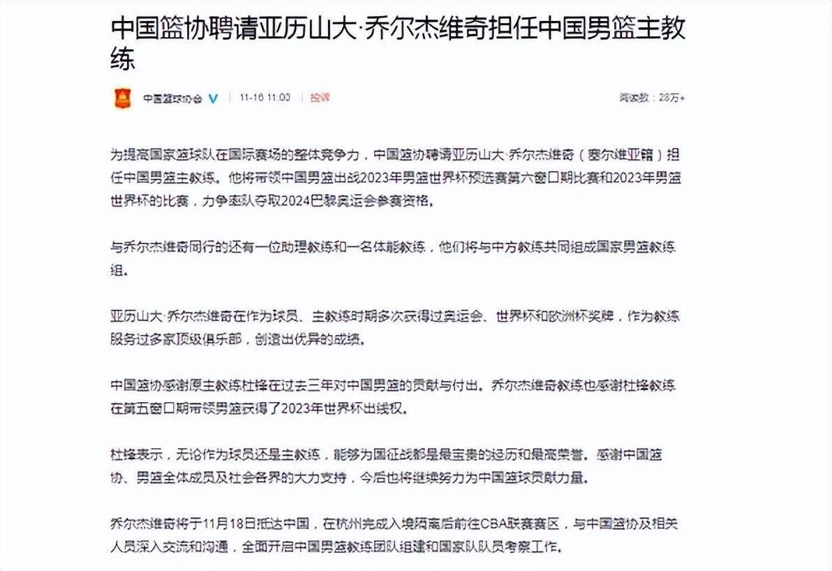北京時間的11月16日,中國籃協官方發佈了最新的聲明,表示杜鋒教練將不再擔任中國男籃的主教練,籃協將聘請喬爾傑維奇成爲新任主教練,將會在接下來的比賽中帶領中國男籃前進,這個消息引起了很多球迷的熱議。